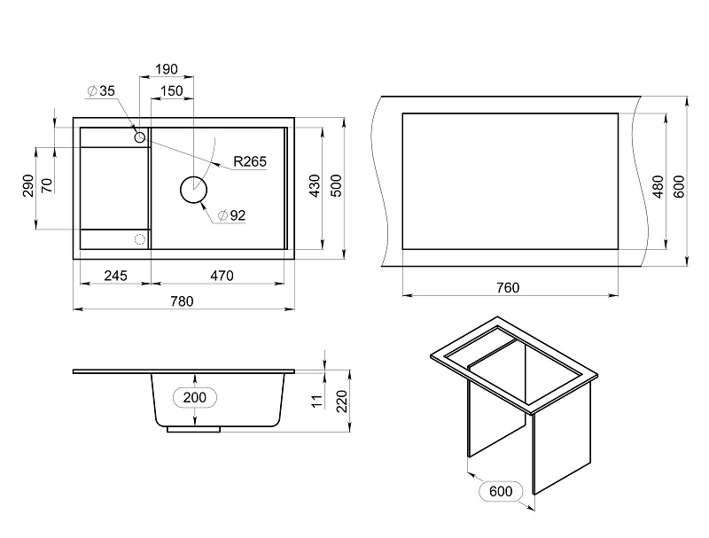 7805, АЛЮМИНИУМ, кухонная мойка, кварц